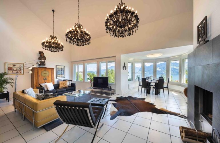 Villa Ysara is its expansive open-plan living room, crowned by a high vaulted ceiling. The living area boasts ample seating in plush leather chairs, an open fireplace for cozy winter evenings, and two formal dining areas that seat six guests each. Both dining spaces offer uninterrupted views of Lake Lucerne and the majestic mountain ranges.