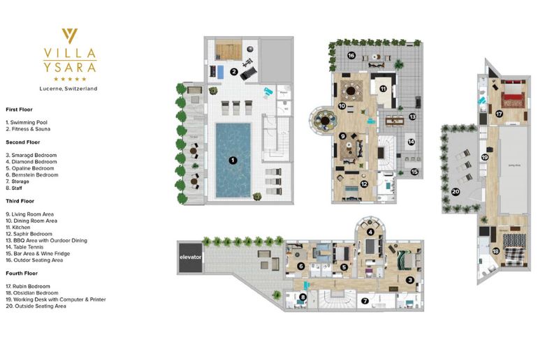Villa Ysara’s layout is designed for convenience and privacy. The first floor features an indoor heated swimming pool, sauna, and fitness area, accessible to all guests. On the second floor, you’ll find four en suite bedrooms with kitchenettes, perfect for those seeking independence. The third floor houses the living room, kitchen, and master bedroom, while the fourth floor includes two additional bedrooms and overlooks the stunning living room and dining areas.